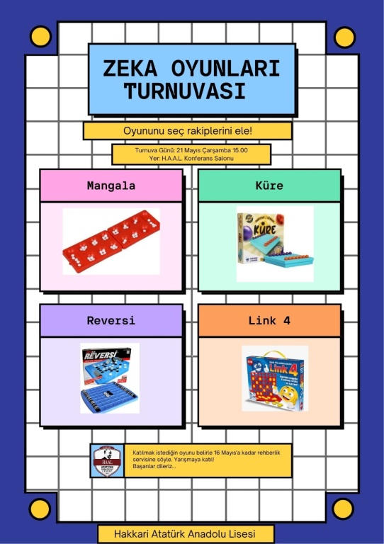 HEGEP kapsamında Hakkari Atatürk Anadolu Lisesi'nde Akıl ve Zeka Oyunları Atölyesinde sınıflar arası zeka oyunları turnuvası düzenlendi. Öğrencilerin stratejik/mantıksal düşünme becerilerini arttırmak, soyut düşünmelerine katkı sağlamak amacıyla oynayabileceği birçok farklı şekilde kullanımı olan oyunlar öğrencilerimiz için atölyede yerini aldı. Sınıflar arası turnuvanın düzenlenmesinde emeği geçen müdür başyardımcımıza, okul psikolojik danışmanımıza, okul hemşiremize ve yardımcı olan öğrencilerimize teşekkür ederiz.
