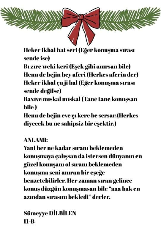 Yüzyıllar boyunca halkın birikimiyle şekillenen atasözleri, deyimler ve masallar sadece sözcüklerden ibaret değildir. Onlar yaşamın içinden damıtılmış bilgeliklerdir. Farklı dillerde ve kültürlerde yer alan özlü sözlerle geçmişten günümüze uzanan bir kültür yolculuğuna sizi davet ediyoruz. HEGEP kapsamında yapılan araştırmalar ve derlenen veriler neticesinde oluşturulan görsel ve metinlerin toplamı dergi ile atasözleri, deyimler ve masallarla alakalı eğlenceli ve anlamlı etkinlikler için Okulumuz 11/B sınıfı öğrencisi Sümeyye Dilbilen’e katkıları için teşekkür ediyoruz.